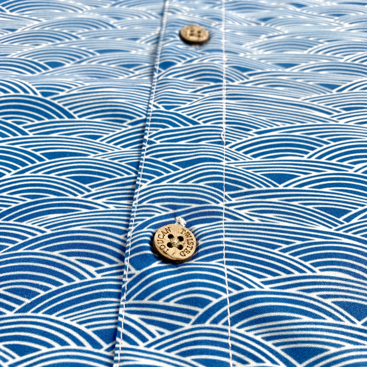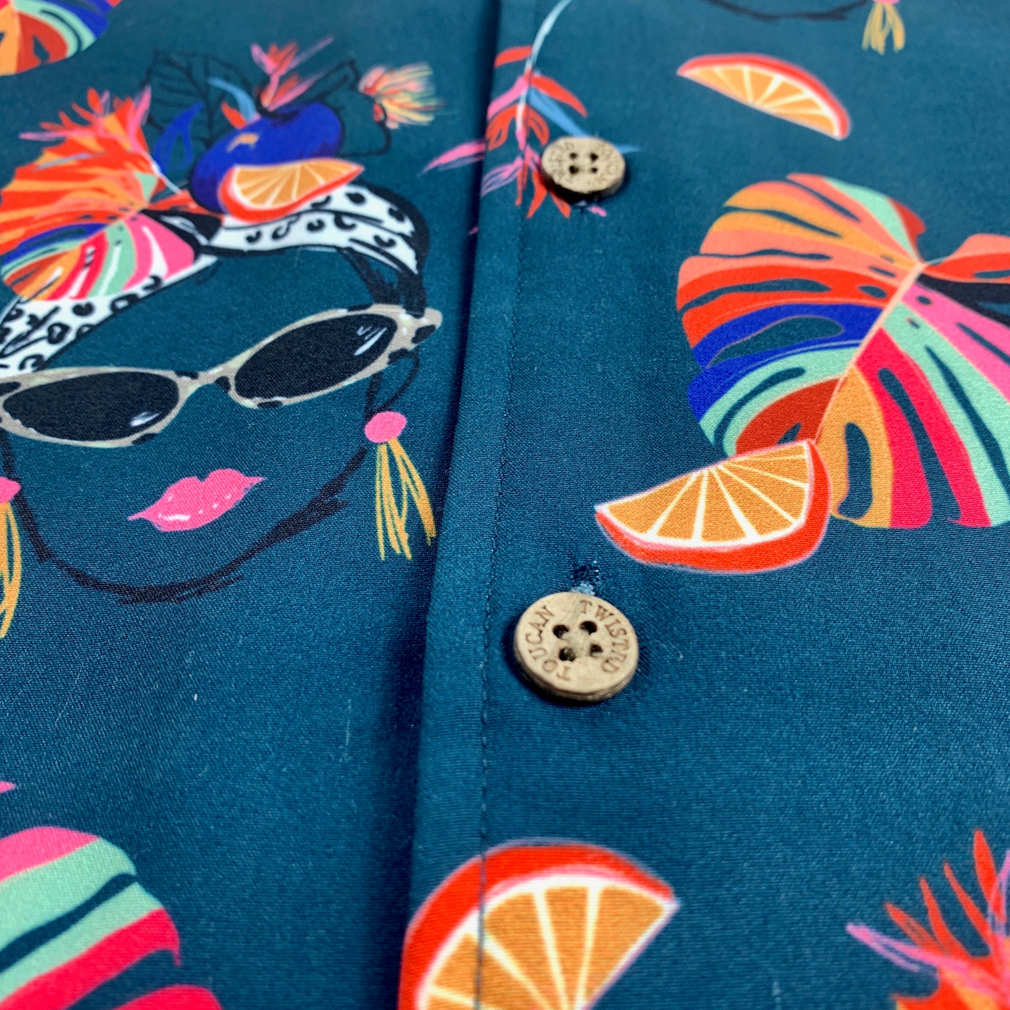 Custom embossed coconut buttons for tropical authenticity.